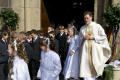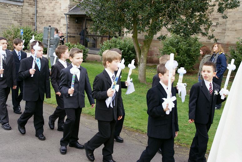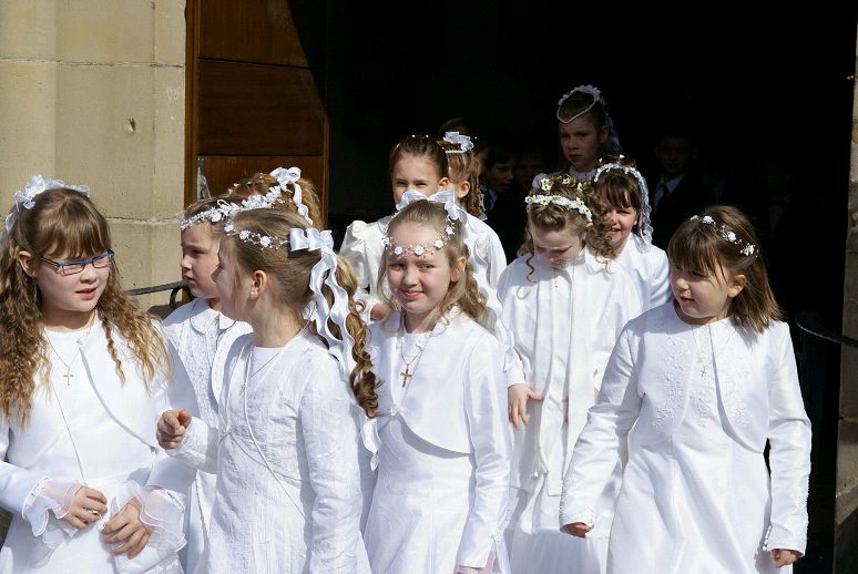 Unten sehen Sie einige Bilder des diesjährigen Erstkommuniontages unserer Pfarrgemeinde. Vor dem Festhochamt wurden die Kommunionkinder von Kaplan Michael Meiser und den Messdienern am Pfarrheim abgeholt. Musikalisch begleitet vom Orchesterverein Wadgassen ging es anschließend bei durchaus schönem Wetter in feierlicher Prozession zur Pfarrkirche.